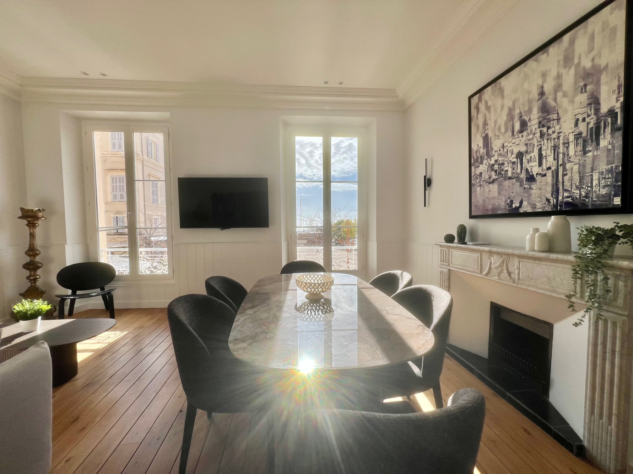 Facing south, the apartment is filled with natural light and offers a stunning view over Port Saint-Pierre, providing a true Cannes experience.