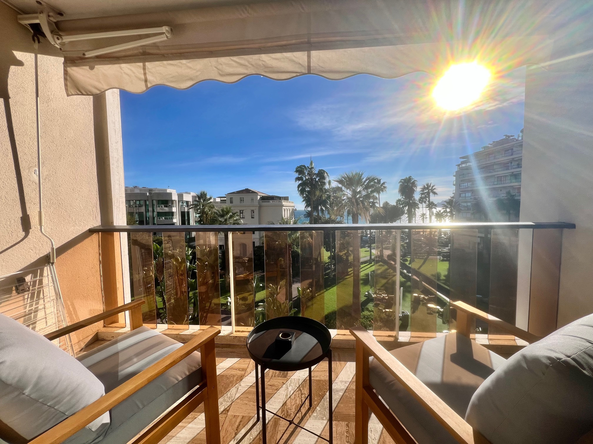 In a renowned building on the Croisette near the Palais, this charming renovated 32 m² studio on a high floor offers a terrace with sea view and modern amenities with a bathroom including an Italian shower and separate toilets as well as a washing machine, the living area features a fully equipped American kitchen, a dining area and a workspace, the studio is equipped with Wi-Fi, air conditioning and a television, the new furniture and optimised layout maximise the space for a comfortable stay, the 8 m² terrace allows you to enjoy the outdoors and an unobstructed view of the sea, located a few steps from the sandy beach of the Croisette and in the immediate vicinity of restaurants, shops and transport, the SNCF train station and bus station are accessible on foot, this studio combines comfort, modernity and authenticity of the French Riviera in a calm and elegant residential environment.