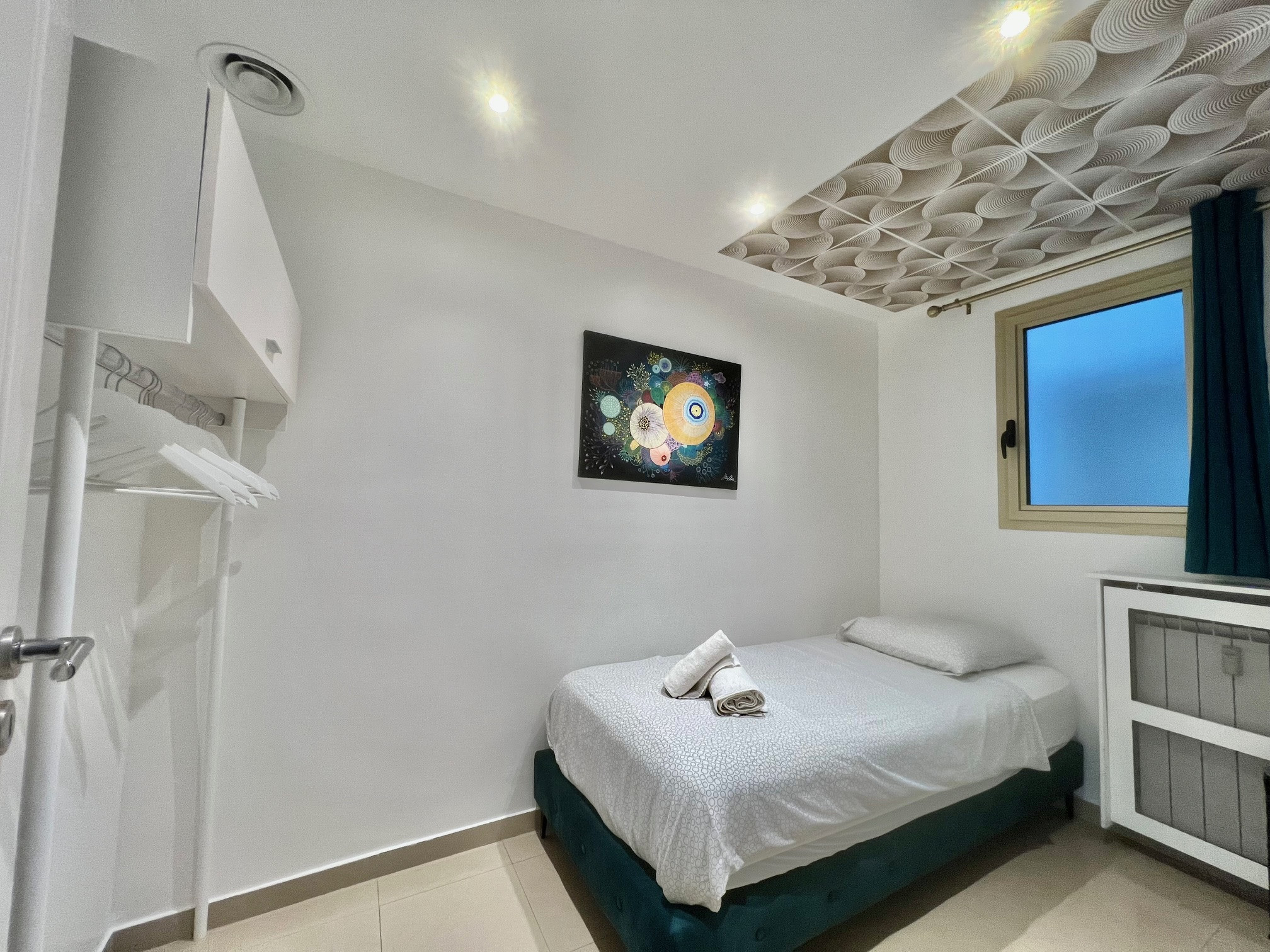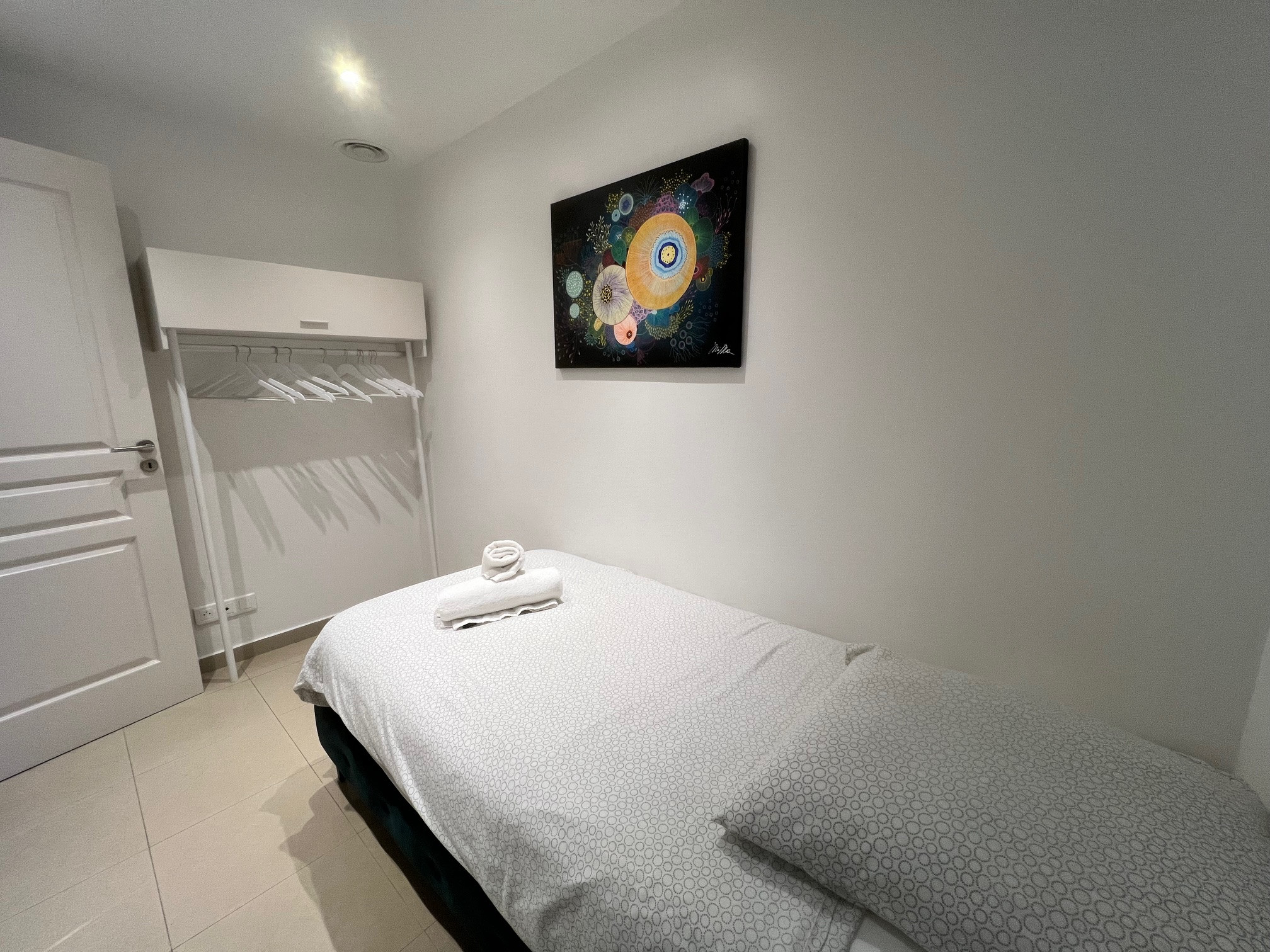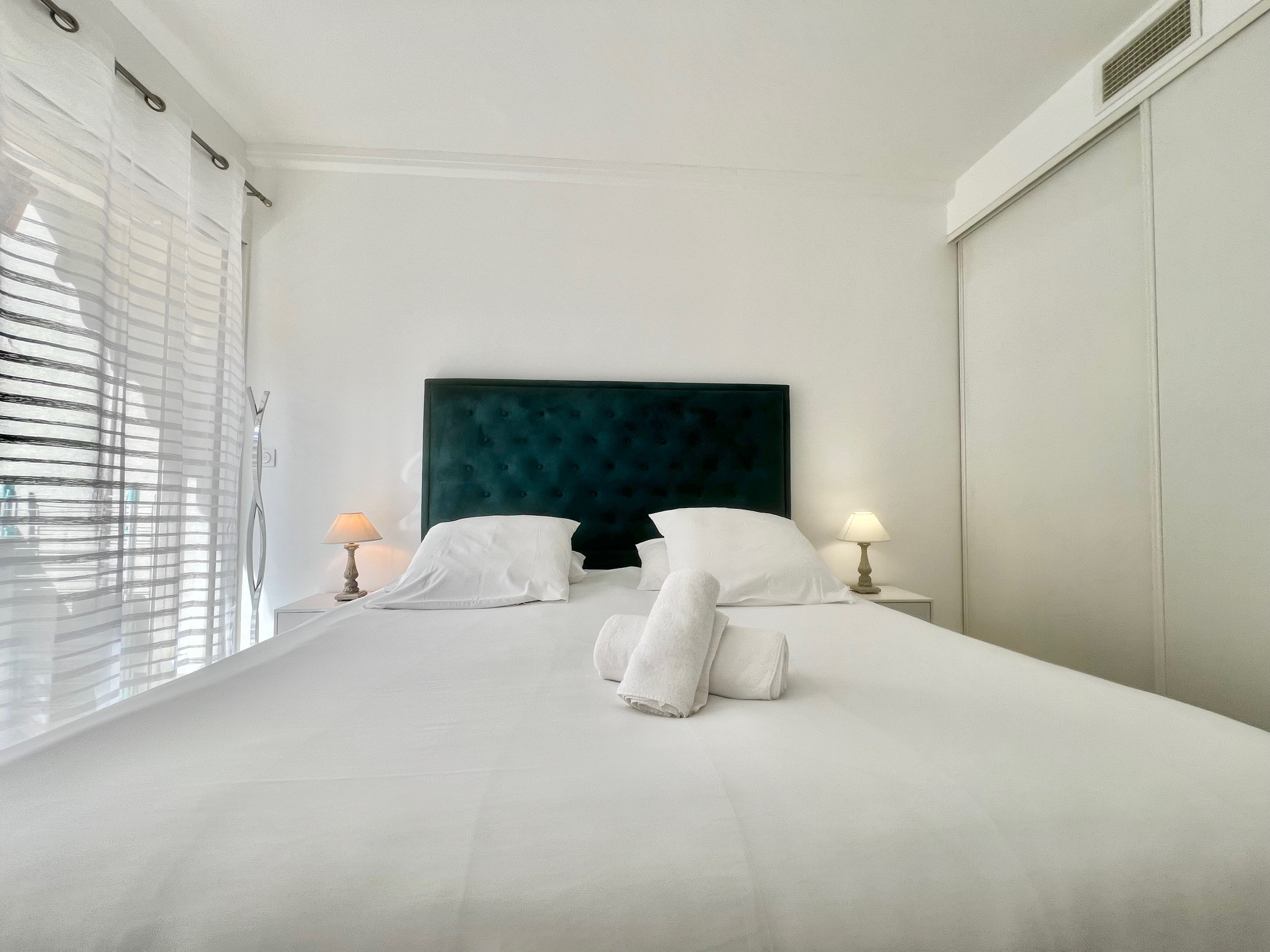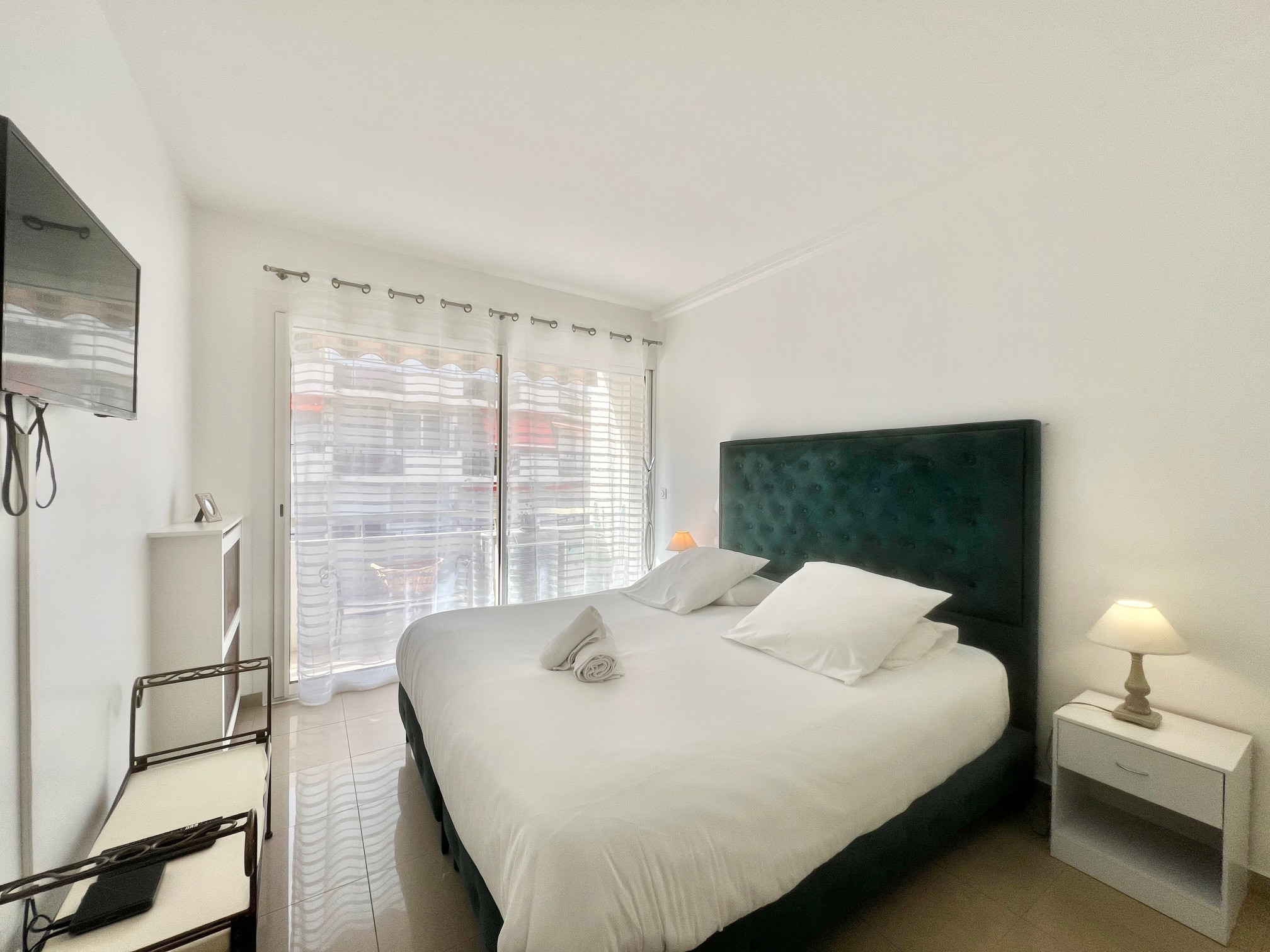 Situé à 50 mètres de la Croisette et adjacent au Martinez, cet appartement 3 pièces refait à neuf comporte une pièce à vivre avec cuisine entièrement équipée ouverte sur un coin repas, coin salon avec canapé convertible, le tout donnant sur une terrasse ensoleillée avec aperçu latéral mer; une première chambre avec lit simple, une deuxième avec lit double ( possibilité de faire 2 simples) ouverte sur la terrasse; une salle d'eau et un WC indépendant.