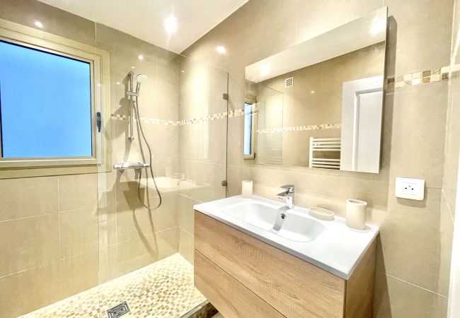 A l'étage ,une grande chambre vue mer avec lit double et un lit d'appoint individuel ,une seconde chambre avec 3 lits individuels, une salle d'eau et un toilette indépendant.L'appartement dispose d'un stationnement privatif et d'une connexion wifi.Transport en commun facile d'accès face à la résidence ,l'appartement se trouve également proche des commodités.