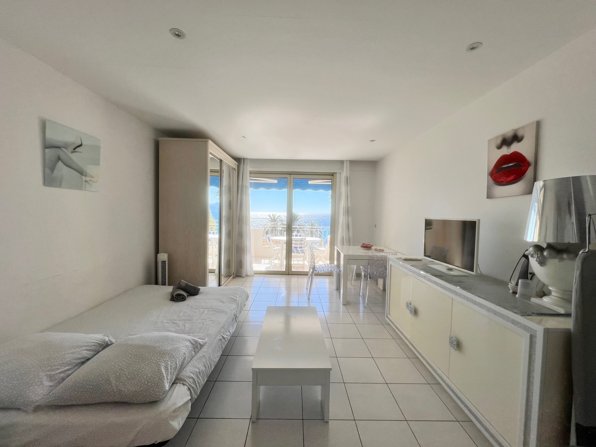 Charmant 2 pièces en étage qui offre une pièce à vivre avec cuisine équipée et ouverte sur le coin salon avec canapé convertible double et coin repas, la pièce s'ouvre sur une agréable terrasse plein sud et vue sur mer et les iles de Lérins.