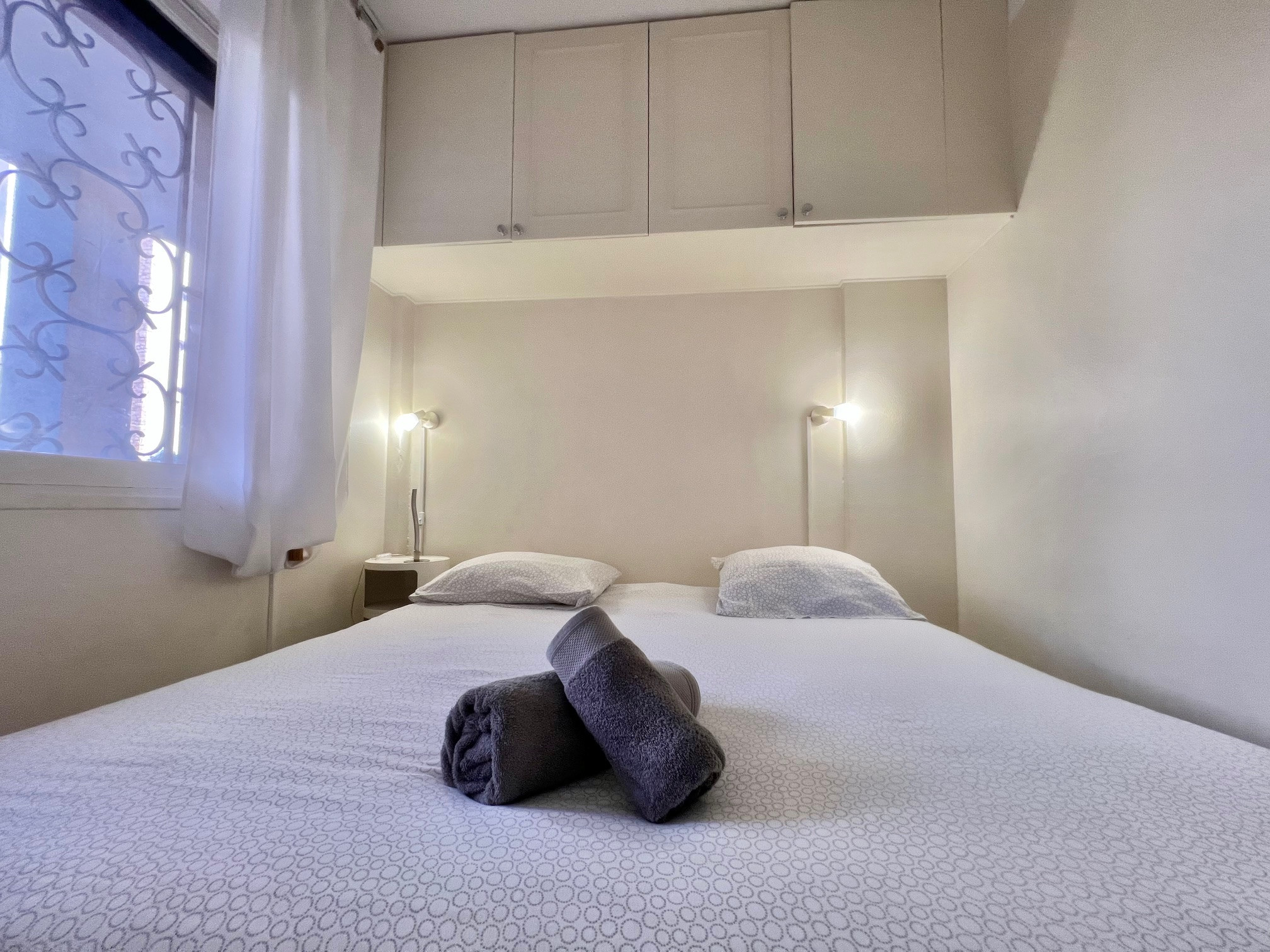 Dans une résidence sécurisée à quelques minutes à pied de la Croisette et des plages, ce 2 pièces offre une pièce à vivre avec coin salon et canapé convertible, coin repas et cuisine ouverte, le tout donnant sur une belle terrasse; une chambre avec lit double donnant également sur la terrasse, une salle d'eau et un WC indépendant.