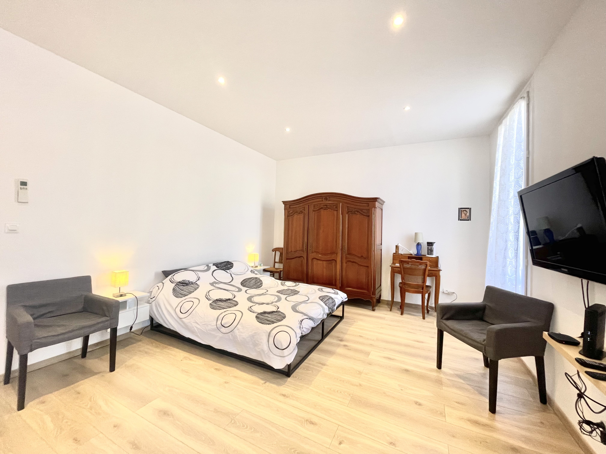 Il dispose de trois chambres avec lits doubles, dont une suite dotée d’un dressing, ainsi que d’une salle d’eau avec WC.