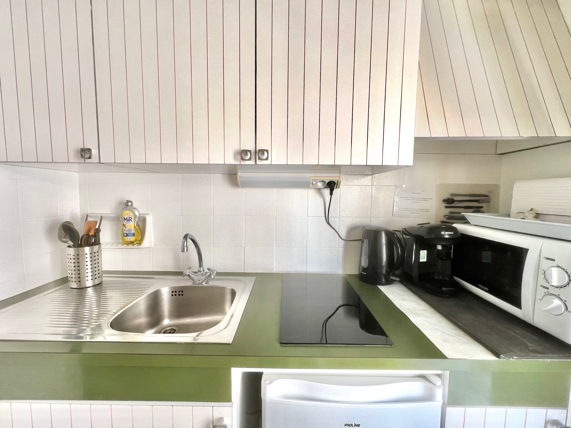 Le studio comprend une pièce à vivre avec canapé convertible, espace de rangement, coin repas et kitchenette ouverte sur la terrasse. Une salle d’eau avec douche et WC complète le bien.